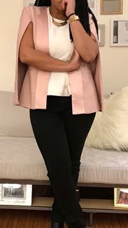 Wearing this cape blazer made me feel empowered. I love the design and color. The fabric feels nice, but it has the wrinkled look to it that doesn't really go away even if it's ironed.