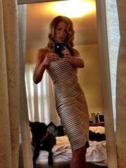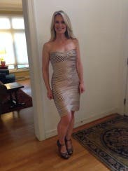 I rented this dress for me and my husbands anniversary dinner because one of my wedding colors was champagne. The dress looked great on. It is form fitting but still pretty much true to size. I still have a little pooch from my last child and wore a wait cincher and you could not see the closure line through the dress which I appreciated.