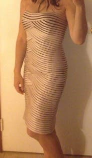I originally wanted a bandage dress but they were all a little too out of my price range so I opted for this gem instead. I got a size 2 and 4 and ended up wearing the 4 and couldn't even fit a bra into it. I did wear spanx under the dress on my stomach just to hold everything in order since the dress has no pull or push and the event included dinner. I thought the length was perfect and I got a TON of compliments on it all night! Overall winner in my book!