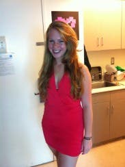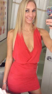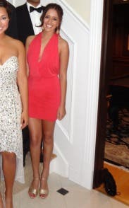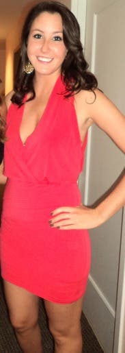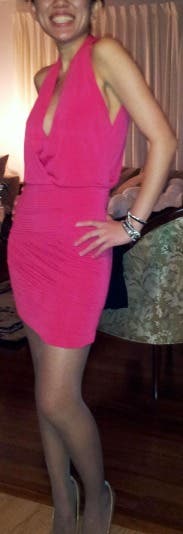 Rented this dress for a St. Patrick's Day pub crawl with my friends. I was fine standing out in a sea of green. The corral color (looks more pink in photos) of the dress goes well with my skin tone and I think would look great with all darker or tan skin tones. Fits true to size. Bodycon bottom with flowy top and super plunging neckline. Note that I was able to wear the U Plunge Backless bra from Victoria Secret which helped give me some much needed cleavage!! I think its a must for this dress if you have small boobs like me. Fashion tape is also a must to secure the top. Was the perfect length for my 5'8"+ height, short but not scandalously so. Photographs very well! Overall another great experience from RTR.