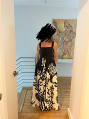 Pockets!!! This was a fun daytime dress that could be dressed up with the right shoes. I’m 5’2”, wore it with flip flops, and had to gather it a little to make sure I didn’t step on the hem. It has button-adjustable straps, which was nice; bust is a little tight and flattened out my boobs. The pattern is unique and beautiful, and I would definitely rent again.