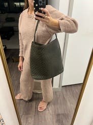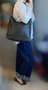 The Bembien Sera Woven Slouch Tote is a spacious day bag with an organic shape and a slouchy silhouette. For a versatile look, carry it with a simple dress or with trousers and a blouse.