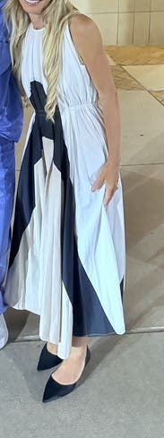 This was perfect for wearing to work and then a work reception/dinner after. The pleats, length, and shape give it some drama, while the neutral color palette is striking but not too flashy, and it’s just regular woven cotton fabric so it’s not too dressy. Really flattering and white I can see from other photos that it looks nice with a belt, I didn’t think one was necessary as the waist fit well and has a nice finishing seam.
