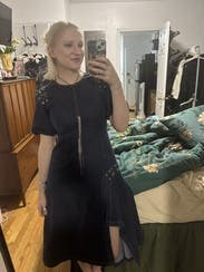The dramatic hem of this dress takes an ordinary denim dress and transitions it to a statement piece. The leather details is nice. The sleeves are puffy, and I thought they added nice balance to the look. I’ll rent this again. Received a ton of compliments.
