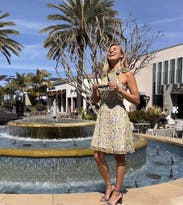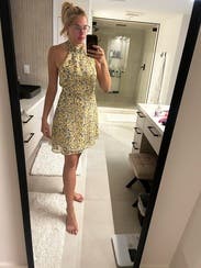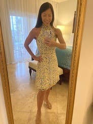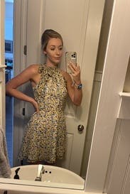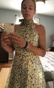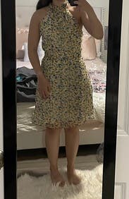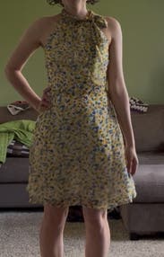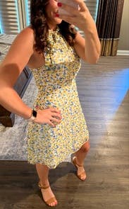 Loved the fit of this dress! Having a small bust that never works with dresses that need cleavage , the high neck line of this dress was perfect. Wore the dress with no bra. Also loved the skirt line, had a little flirty movement. I might actually look into buying this one! It would work for any summer event!