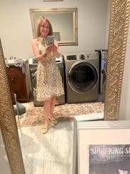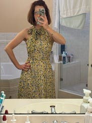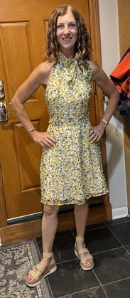 Cute dress with a unique tied neckline. It fit nicely and it was perfect for afternoon tea and a baby shower.