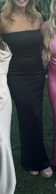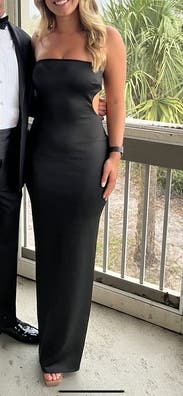 This dress was wonderful! I’ve always been averse to strapless/sleeveless because they always slide down and cause wardrobe malfunctions but this wasn’t a problem at all for this dress due to the strong elastic at the top. I danced the night away and the girls stayed contained just fine :) I felt like a bombshell, would totally rent this dress again for future fancy occasions. I got the sizes 4 and 6 as a backup but didn’t even end up having to try on the 6, the 4 fit like a glove. The material is snug but also stretchy/has some give to it if that makes sense, which made it very comfortable. I got tons of compliments and felt very fancy. 10/10 recommend!