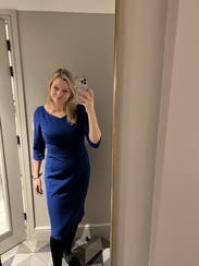 The color of this dress is beautiful. The blue really stands out. Black Halo dresses have become one of my go-to brands for work dresses. The fit is TTS and fits like other Black Halo dresses. If you're on the fence or in between sizes, might want to size up just to be on the safe side. The neckline gives the dress a little something extra, but can still be worn with a regular bra. If you have bigger arms, be aware that the sleeves might be super tight/too small to the point of being uncomfortable. I have pretty muscular arms, and the sleeves just fit. There is a little slit on the sleeves at the elbow though, so it's still easy to bend arms and comfortable to wear. Hit at a nice, conservative length on my 5'3 frame.