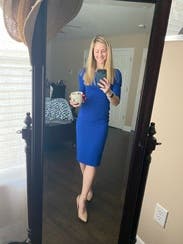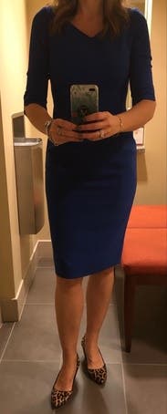 Black Halo is rapidly becoming one of my go-tos for work dresses. They have been consistently high quality with great true to size fit and details that make the dresses pop. In this case, the color and the matching V in the front and back. I'm large chested so A V neckline can become racier that intended for work, but this hit the perfect balance. The color is amazing in person- I'm had several people comment that my blue eyes really popped!