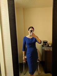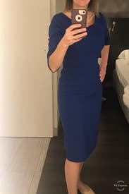 This is a killer work dress. Great pop of blue color, and really contours nicely. My only complaint is the arm/shoulder area is a bit snug (especially if you have a larger chest) so being able to zip to the back, especially with the angled hemline cut, is challenging.