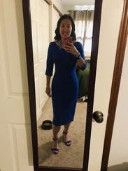Black halo has become my go-to for sleek and flattering work dresses. This one is a classic fit. Like most halo dresses, it may feel a bit restrictive in the chest/arms, but stretches out to be comfortable in about an hour. Vibrant blue color, but still work-appropriate.