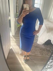 Loved this gorgeous blue dress. The fabric doesn't have any stretch so was a tiny bit constricting but worth if for the flattering fit and vibrant color. We were attending a religious service that required covered shoulders when I realized I own zero dresses with sleeves! This dress was classic and modest but still felt flattering and a little sexy. I'm usually a 10 or 12 and very curvy and the 12 fit really well.