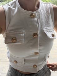 White (99% Cotton, 1% Spandex). Tops. Crew neck. Sleeveless. Front button closure. Shoulder to hemline length: 13.5". Imported.