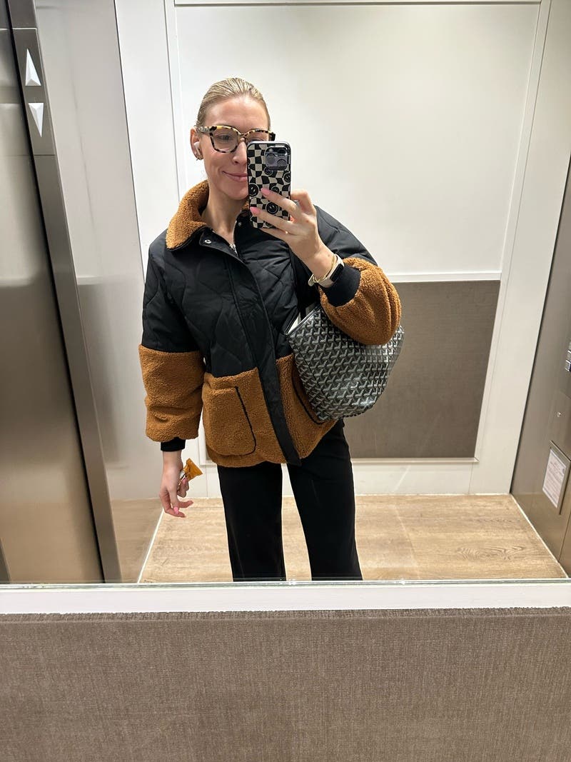 This BLANKNYC jacket features a bold contrast of black quilted fabric and plush brown sherpa sleeves and collar, offering a modern and edgy look. Pair it with sleek leggings and ankle boots for a balanced, contemporary outfit.