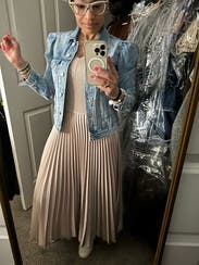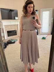 The taupe color washed me out so I added a black jacket and belt. Tons of compliments on the swishy, gorgeous skirt. Very comfortable to wear. I wore this dress to a work conference and a family dinner out. Versatile.