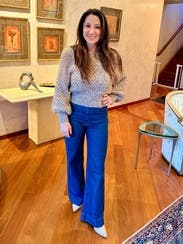 I liked the sweater and its dramatic sleeves. But, it’s definitely heavy and a bit scratchy. Love the drop shoulders for my small frame. Keep in mind the silver sparkles are prominent.