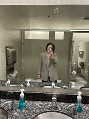 Great jacket I paired with a blouse and wide leg jeans. Felt modern and classic. Agree with prior comments the color looks much more gray in person than the photos