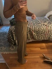 Brown plaid cotton (63% Polyester 34% Viscose 3% Elastane). Pants. Front zipper fly with button closure. 34" inseam. 11" rise. 19" leg opening. Imported.