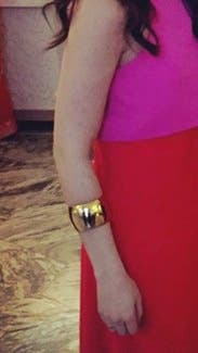 This bangle was larger than expected yet worked really well when paired with gold earrings and clutch. Reasonably priced rental that was rented for a pink & orange Herve Leger dress that didn't fit but worn with a hot pink sun dress and gold edgy earrings.
