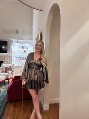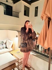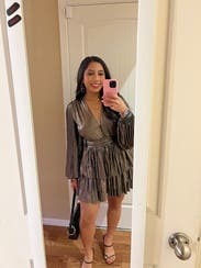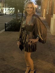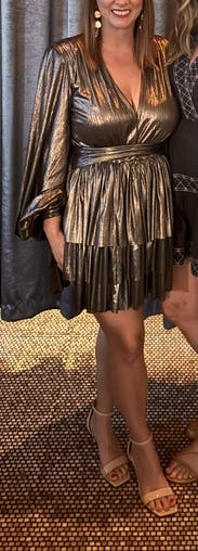 The fitted top with the tiered skirt and billowy sleeves are so fun and the metallic sheen really adds an element. Comfortable and fun. I wish I owned it because I want to wear it again.