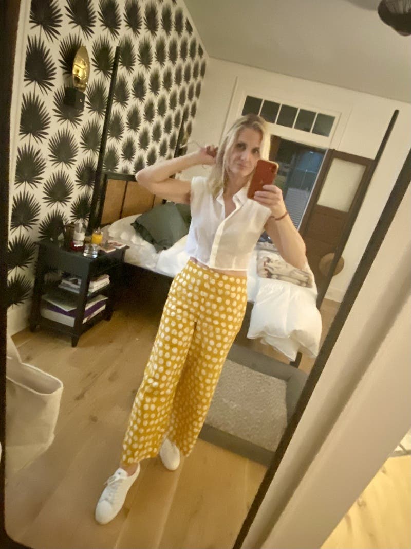 Busayo Collective makes these yellow polka-dot pants that are sure to brighten on-looker's days. Style with the matching top and the Verona Clutch from DeMellier.