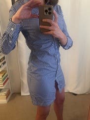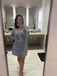 This dress was super cute but too short for work. The lowest button was too high up the dress, just above my crotch. I had to bring a sweater with me to every meeting and wear it on my lap😬 This size was also very tight, would size up next time. Loved the fabric though!