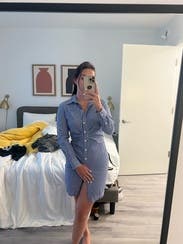 Arrived NWT and when I first tried on I was obsessed: a shirt dress so far from frumpy/boxy it actually hugged my curves without being tight. And the bottom button hits just high enough… almost too high for the office! One more nitpicky thing is that it was a bit wide in the shoulders and the collar kind of splayed out, making the top kinda big overall. I found myself adjusting it a lot. But the pros far outweighed the cons. I’d rent it again.