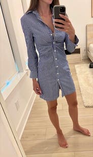 Pictures are very deceiving with this dress. First, it’s one of the best items I’ve ever rented from RTR. Unbelievably sexy for what I intended to be a casual summer work dress. Second, It is very fitted and hugs your curves. I sized up as others suggested and it was still pretty tight. If I wanted any shot at wearing this in a professional setting I’d need to go up in size again. Last, it is short! The bottom button hit right at my underwear. Don’t rent this for work but maybe a hot date on a sail boat!
