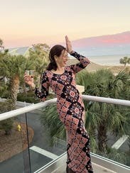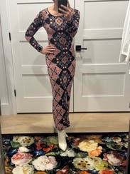 Loved the floral pattern. Wore to an indoor fall cocktail event; kept me the perfect temperature (not too warm). High-quality material, not too heavy. I'm petite (5'0", 100lb) and usually a petite 00-0. The XXS fit well (arms perfect length for me), dress was maxi length in 4" heels.