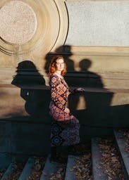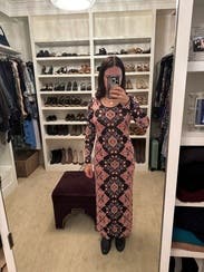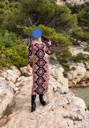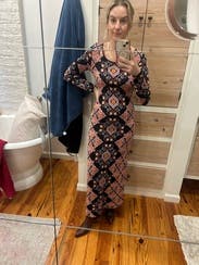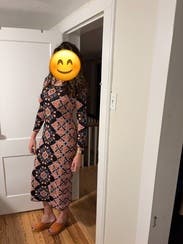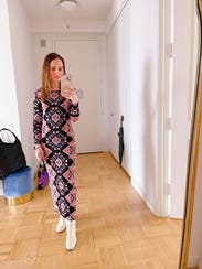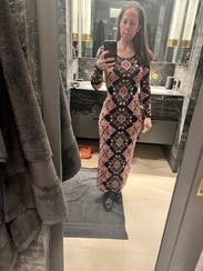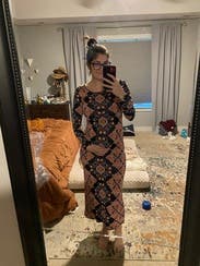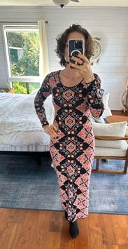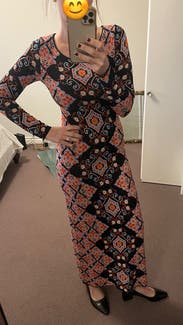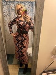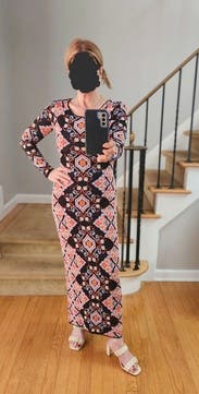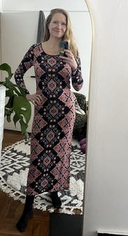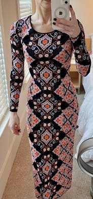 I wore this to work and dinner. It’s a slightly heavier weight stretch knit. It’s tight in the mid section but the print helps hide bumps and lumps. The length hit at the ankles for me, which was perfect with ankle boots.