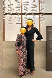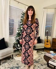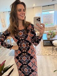 The dress fits like a glove and is so soft and comfortable. The pattern and colors are just gorgeous. Can be dressed up or down!