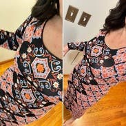 Once you could wrangle it on, it hugged well and the fabric pattern was very bold and fun. When I first out it on I felt claustrophobic but then it calmed down. 23 weeks pregnant and it was flattering!