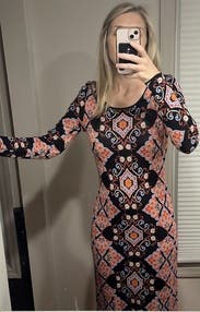 Wore this twice to work. I loved the orange and black pattern for Halloween-time. This dress is FITTED. I found it pretty tight in the shoulders (but I'm broad), and had to wear my bra straps pulled down since the neckline is so scooped. The hang tags pop out constantly...but I wasn't sure if I'm allowed to cut them lol. Not my typical style but a great rental! Felt very nice and thick.