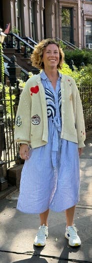 I wore this dress all summer. It has generous proportions and is cinched with a belt. The appliqué work down the front make it stand apart from other blue and white striped beach dresses.