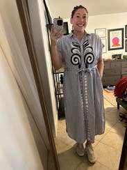 This dress is so cute and comfortable. I tied the belt in the back to show off the beautiful embroidery. And it has pockets. It runs large, so size down.