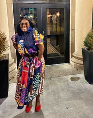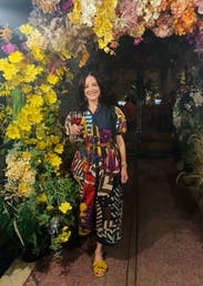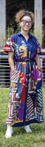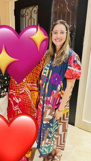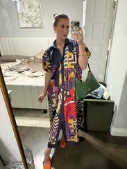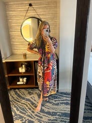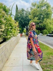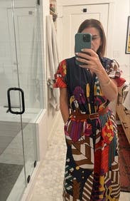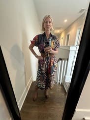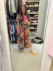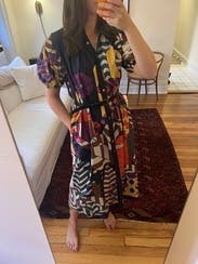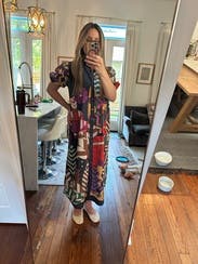 I recently rented the Valerie pleated kaftan by Carolina K in a medium, and I must say, the reviews were right - this dress is HUGE! I was concerned about downsizing and having a tight chest, but that wasn't the case at all. I could have easily gone for a small. However, when I belted it, the extra fabric didn't bother me, and it actually looked great. The bright and fun pattern, along with the puffed sleeves and multicolored buttons, added some interesting details to the dress and made it so much fun to wear. It was incredibly comfortable, and I felt pretty in it. I would not hesitate to rent this dress again! Follow me on IG for more RTR reviews! @lesliedillon