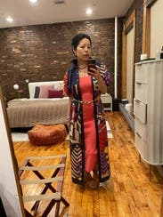 LOVED this piece. So easy to wear. Beautiful detailing with the pleats over the shoulder. Quality construction and the collar holds a pop. Pockets! Just needs a little steam, no need to fuss with the iron. Kaftans can overwhelm a petite hourglass, but this piece snaps together with a belt. Any belt and all the belts-- absolutely needs a belt. So many beautiful colors through this fabric, it was a blast to accessorize! Paired with flippies, strappy heels, loafers, and studded clogs. Worn on date night, beach cover up, mini golfing. This piece made me smile.