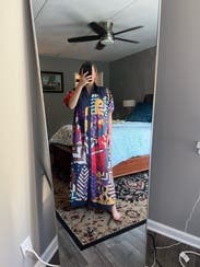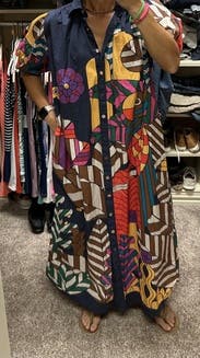 This runs big, vibrant colors. Can dress up with heels or dress it down with sneaks. I would wear it belted as it's pretty shapeless with no belt. Not too much fabric. Must be ironed.