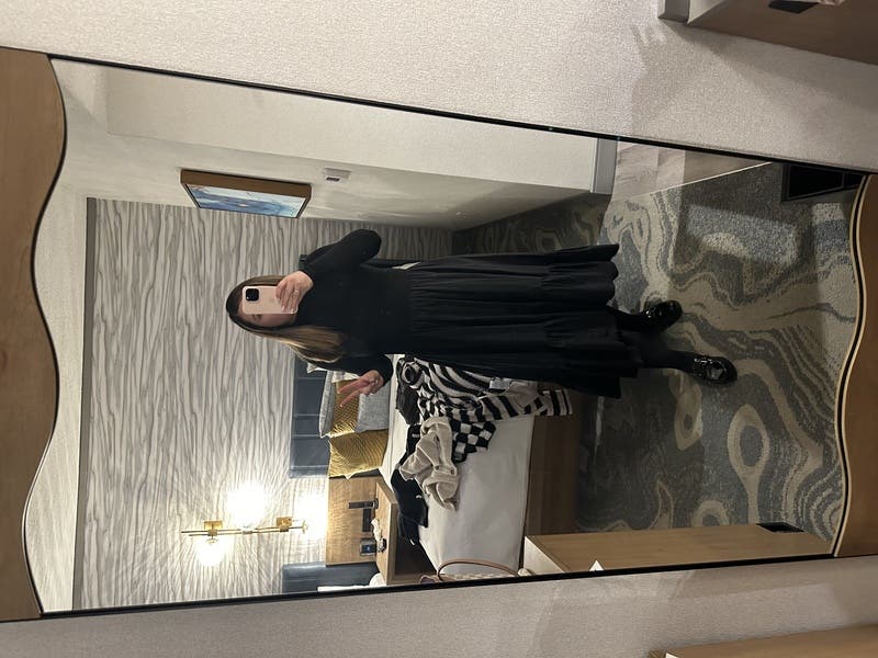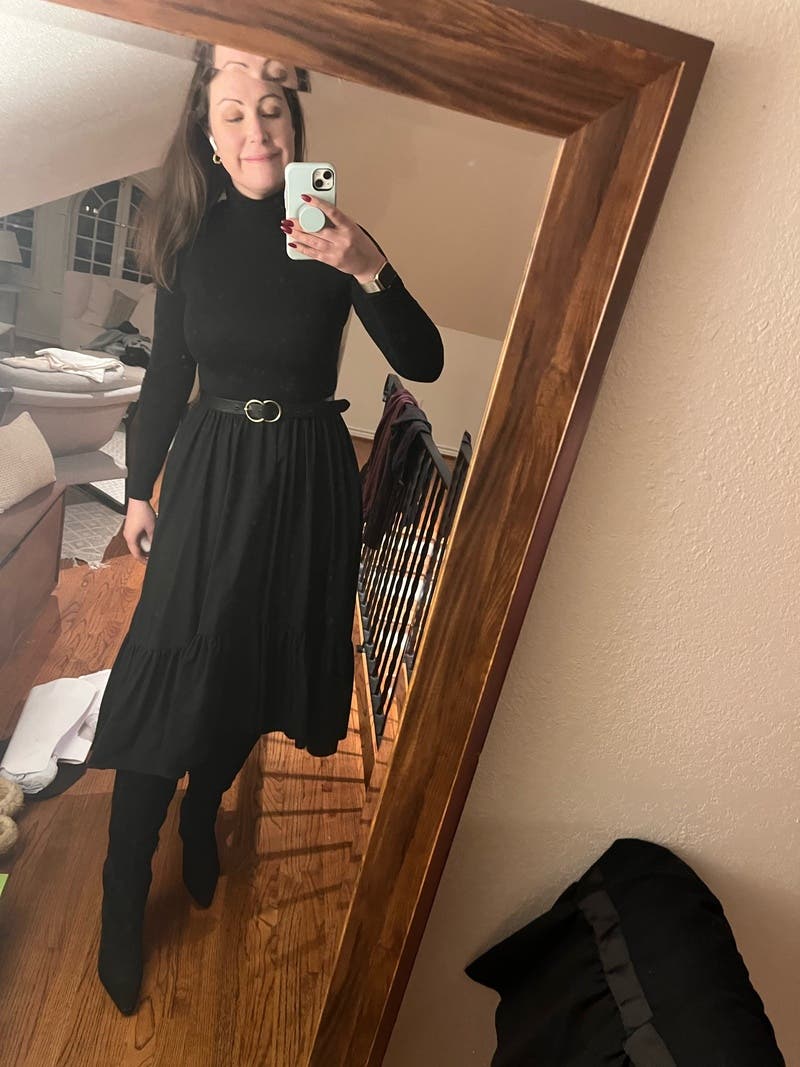 Black cotton blend (Bodice 95% Viscose, 5% Elastane/Skirt 70% Cotton, 28% Polyester, 2% Elastane). A-line. Long sleeves. Turtleneck. Pull on. 45.5" from shoulder to hemline. Imported.
