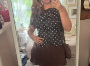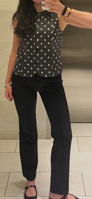 Black polka dots (90% Polyester, 8% Linen, 2% Spandex). Tops. Boat neck. Sleeveless. Front button closure. Shoulder to hemline length: 21.5". Imported.