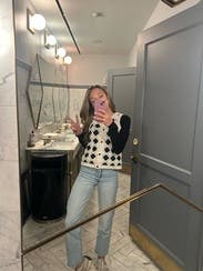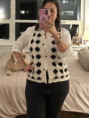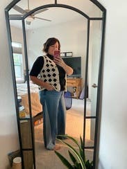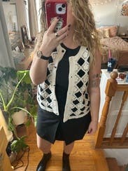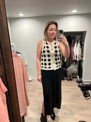 Cute sweater vest that is trending right now. I thought it would be too long on my petite torso but not at all. I do wish the top was a bit more fitted but I am 32A so not going to happen. Cute, I'd rent again