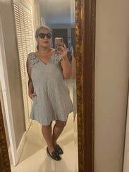 I only wore this once for a date night because I didnt think the bows on the shoulder were my vibe, but the dress slides on so nice, the pockets are always a perk, and its effortlessly flattering. I can fit in mediums, and large, but tried the XL and it was still tight in the bust, not too noticeable though. I would size up.