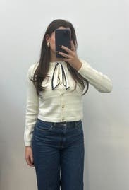 Seriously loving this piece! The material is super comfortable, warm, and not itchy at all. What I really love is how versatile it is. You can wear it open as a cardigan or all buttoned up as a top. That little silk tie detail at the top is a fun touch that gives the cardigan a sophisticated but still playful feel. It's a great piece to have in your cardigan rotation. You can easily dress it up or down for literally anything: running errands, work, or going out to dinner. Recommend!