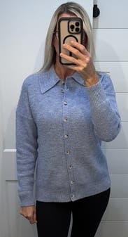 This oversized sweater is super soft, lightweight, and not itchy at all, I didn’t need to wear anything underneath. I’m 5’10 and 16 weeks pregnant, and it fit comfortably with plenty of room. The length is great for taller frames, and the blue color with tortoise buttons adds a fun, unique touch. Cozy without being bulky, an easy favorite for everyday wear.