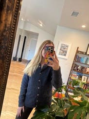 I loved this sweater. I wore it under brown corduroy overalls (wish I had more pics of that look!) and also dressed it up with denim. It paired perfectly with plaid too for a rugged-but-polished vibe. Incredibly warm and cozy, with buttons that make styling easy. The deep blue color is such a love — it feels timeless and versatile.