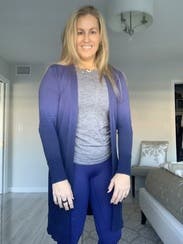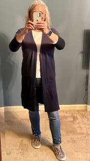 Beautiful dark blue color, perfect length - fell just above my knees (I’m 5’4”). I wore with a black tank, white tank, white tshirt and with jeans and leggings. Just a very classic look. The arms are fitted and a little snug but not tight. I absolutely loved this topper!