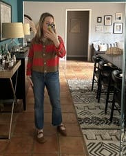 Soft and cozy knit sweater with a relaxed, slightly cropped fit. So easy to style. I loved the bold stripes and color combo. My husband called it my Freddy Krueger sweater. What does he know lol