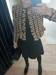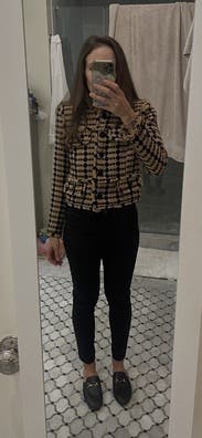 For those that attend work conferences, you know it can be freezing in the meeting rooms. You also know that versatile pieces you can wear during the day and repurpose for night are important. This jacket hits both marks. My only regret was ordering a size larger than normal. During the day, I paired this with the black Vince mock turtle-neck dress and received tons of compliments. At night, I wore it to dinner with a pair of crop jeans and a black bodysuit for a little added polish to my casual look.