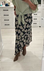 This skirt is very cute in person! I absolutely love the pattern, material, and cut. One cautionary piece of information is that this skirt is long. I could actually wear it as a dress. It was almost dragging on the floor in the size I got, so I would consider that when ordering. It also was a bit too big in the waist but overall a very cute skirt! I would suggest potentially sizing down in this skirt if you order.