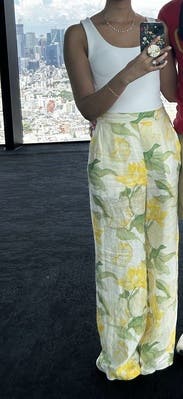 Loved these floral linen trousers! True to size, no stretch. Fitted waist, flowey bottoms. High waisted, and long length! Liner can be seen under fabric, see photo! 100% linen so wrinkles are expected! Great for long legs or heels!
